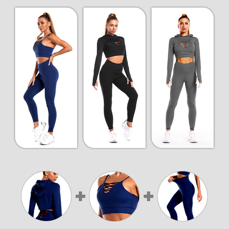 Workout Sets 3 Piece Long Sleeve Crop Tank Top + Sport Bra + Leggings